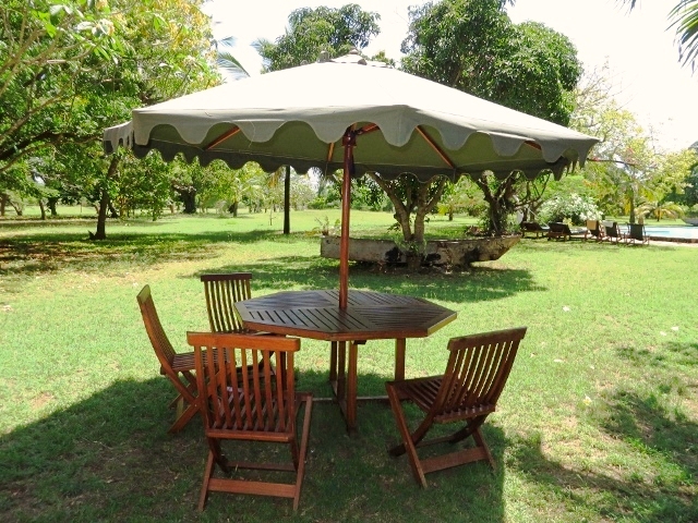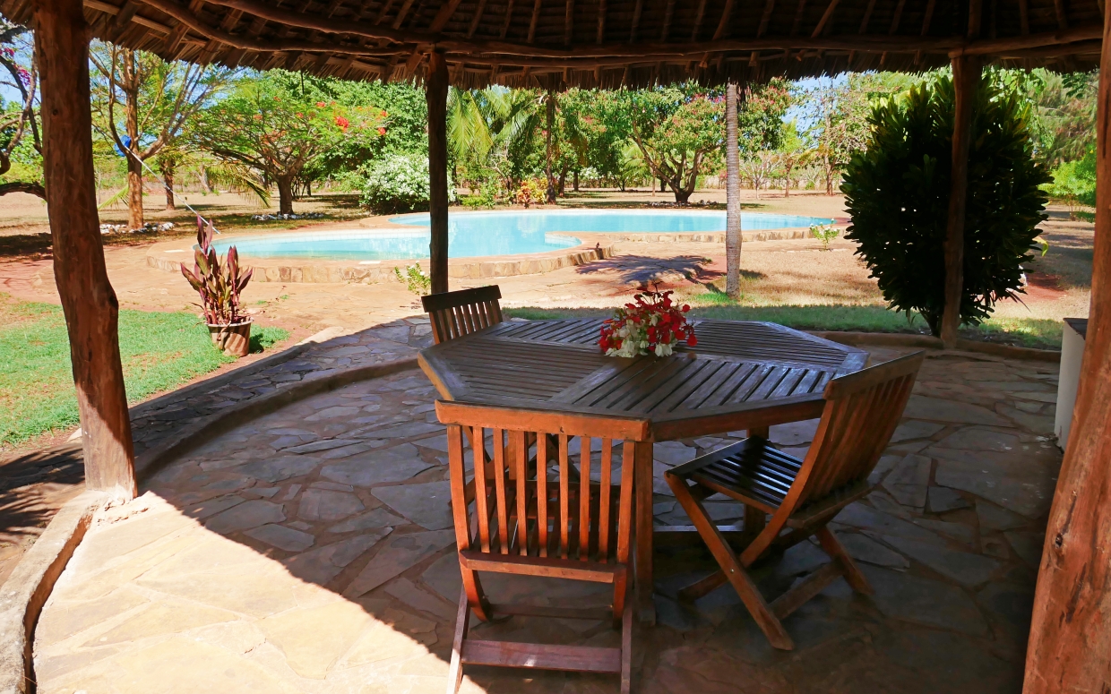 Cottage 2: 3 bedroom bungalow with all rooms en-suite, sitting room and covered verandah overlooking the pool and gardens. The kitchen has a large serving hatch into the dining/sitting room. There are 3 doors out onto the verandah at the front overlooking the pool and gardens.