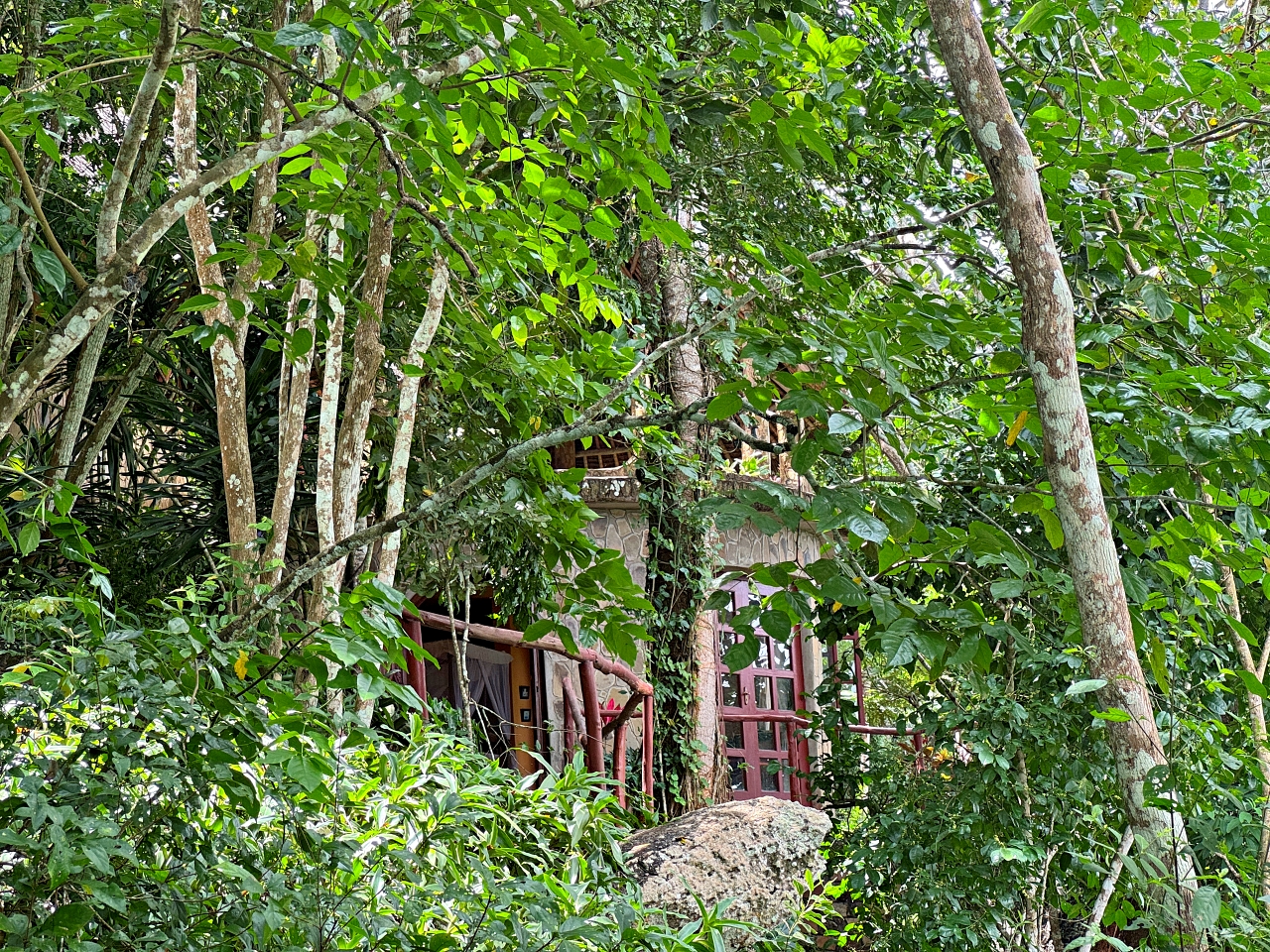 Treehouse Villa: Bedroom; bathroom; open covered lounge area; outdoor jacuzzi on the patio. Upstairs there is a BBQ area
