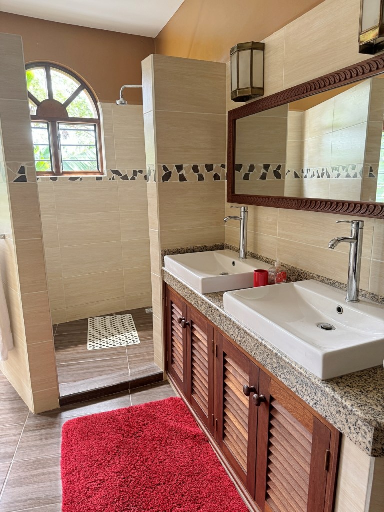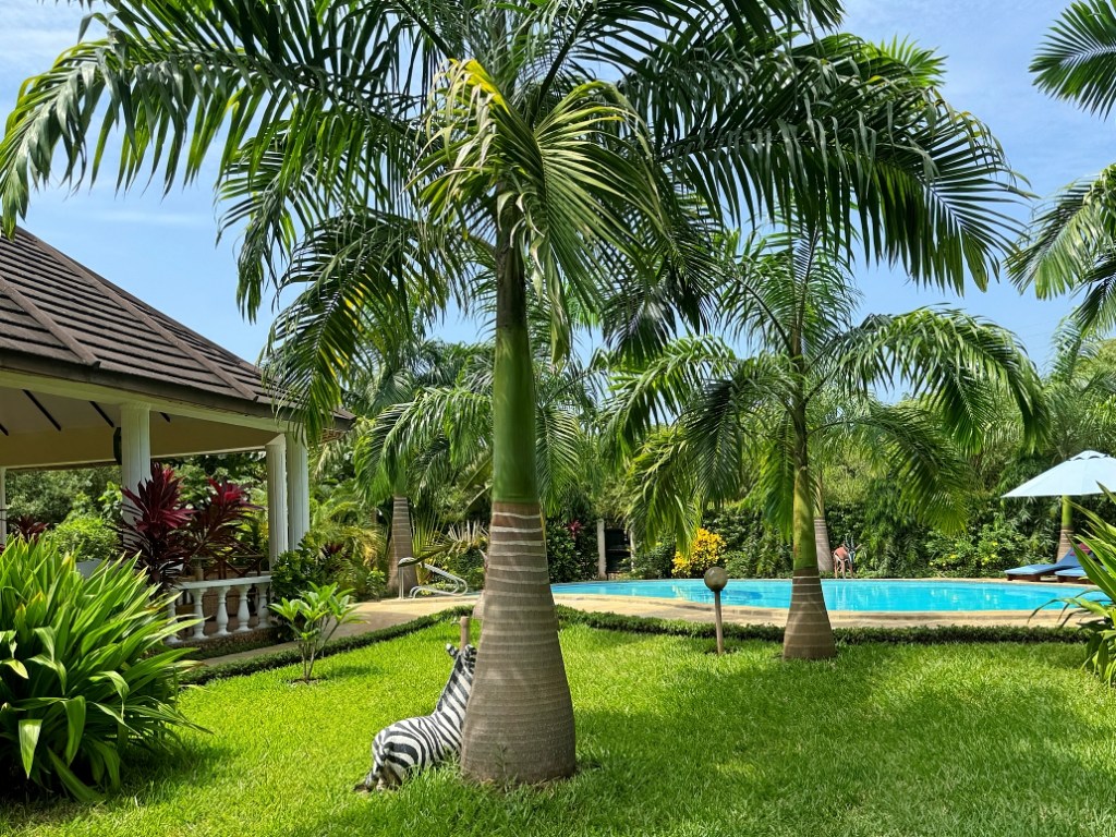 Enjoy the peace and serenity of your personal sanctuary. You’ll most likely be lounging on the veranda most of the time, overlooking the pool and the lush, palm-filled garden. This house sits in a secluded corner of a gated community, and there are plenty of seating options to choose from including poolside, various places on the large verandah or under the teak tree. The house is quite new and the gardens are incredibly green.