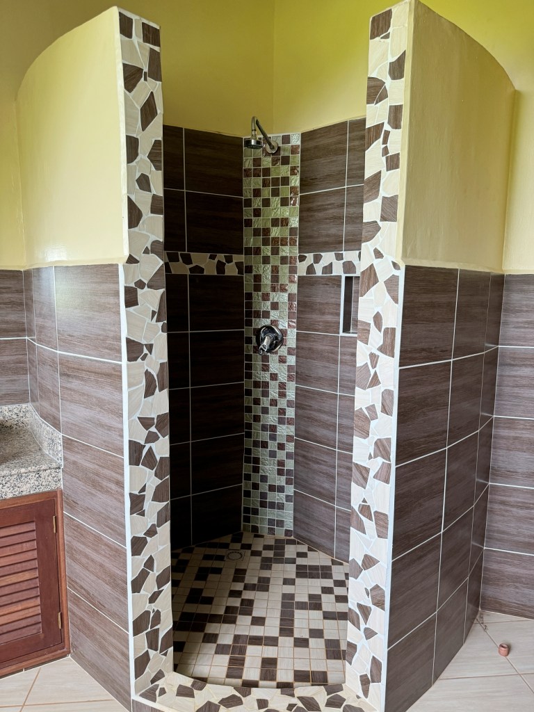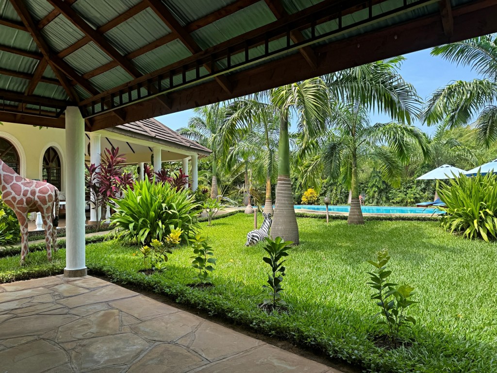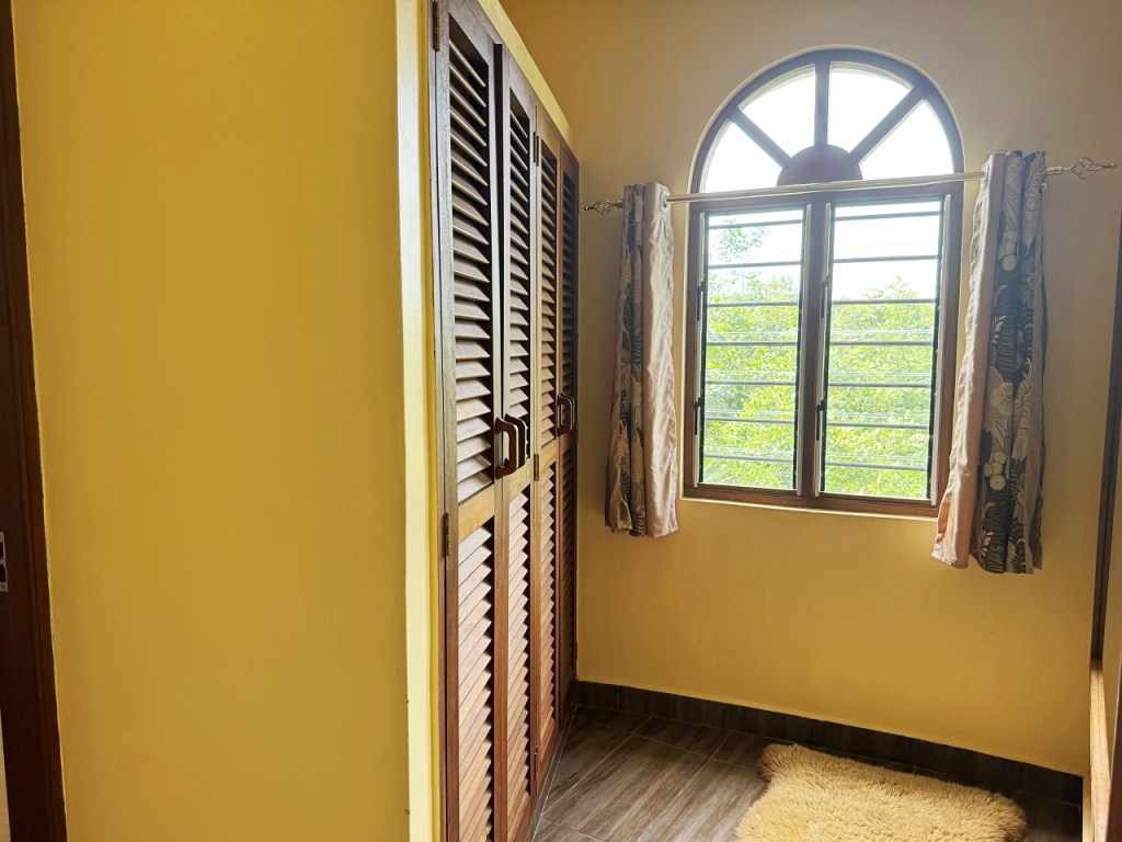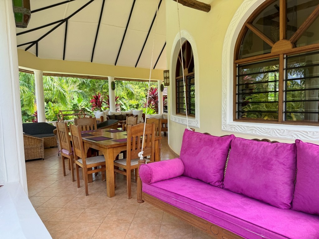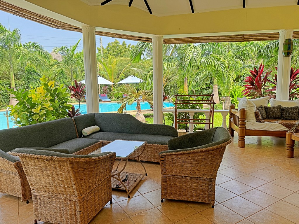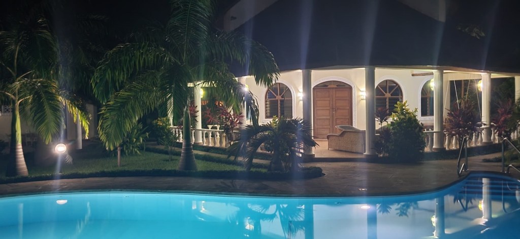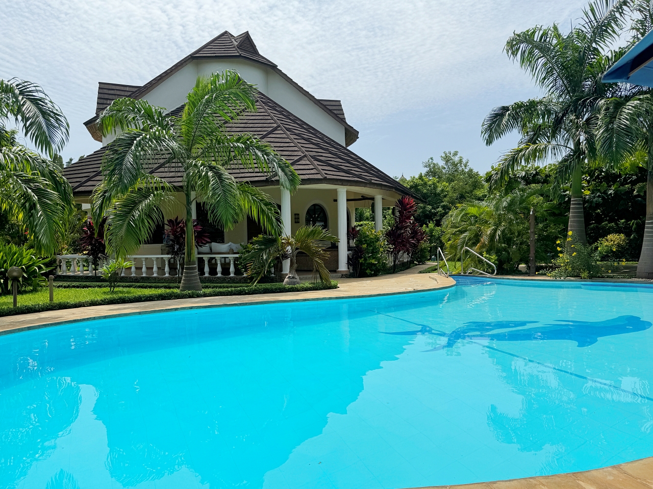 The house is on it’s own compound within a gated estate. You enter the property and arrive into an oasis of green garden, pool and clean house. The verandah wraps around 1/3 of the house with various places to sit such as at the outside dining table, swing chair, arm chairs. There are also pool beds by the pool. Inside there is a lounge area with TV, large kitchen, dhobi room and guest toilet.