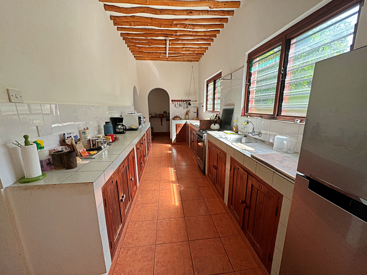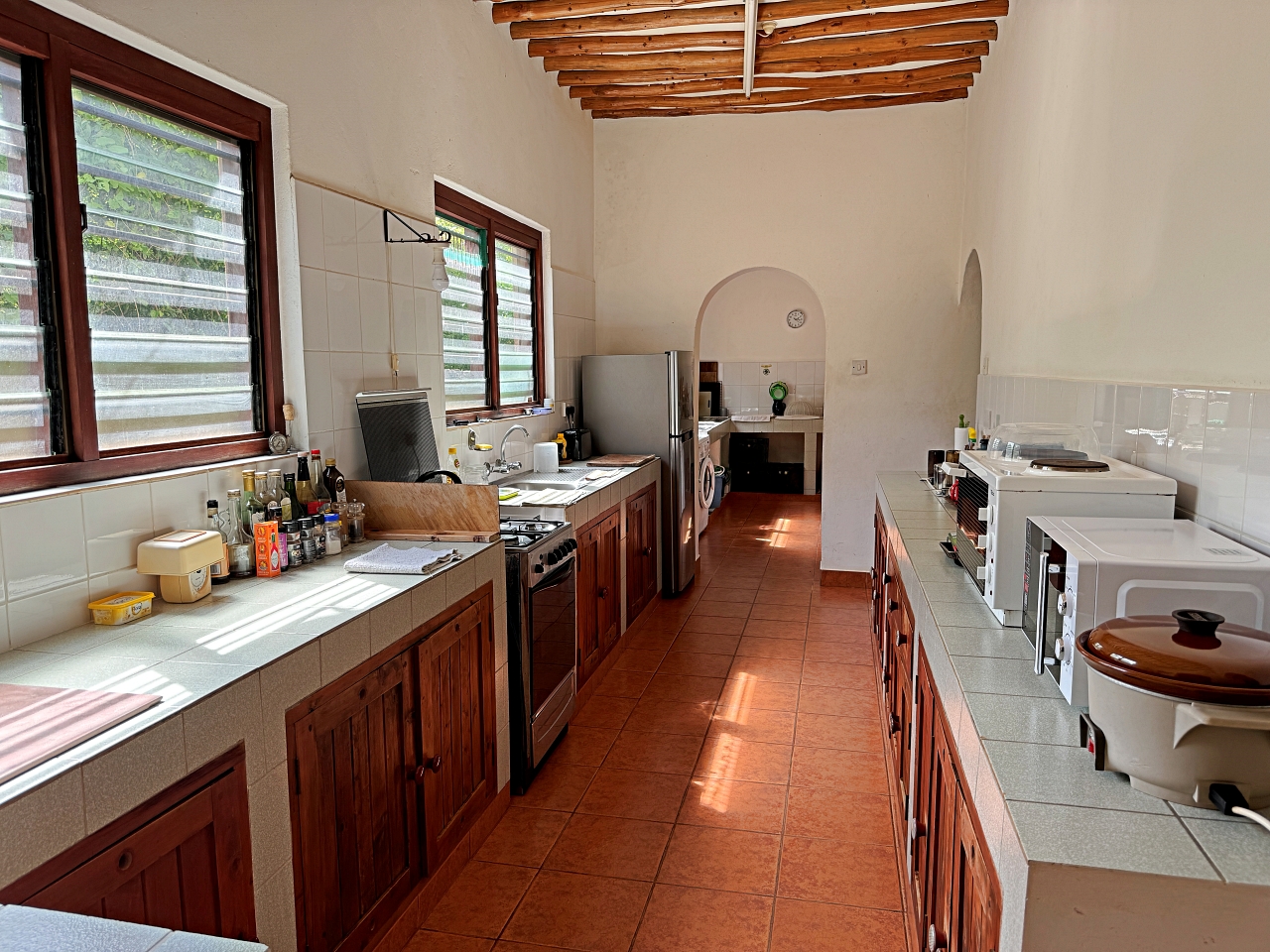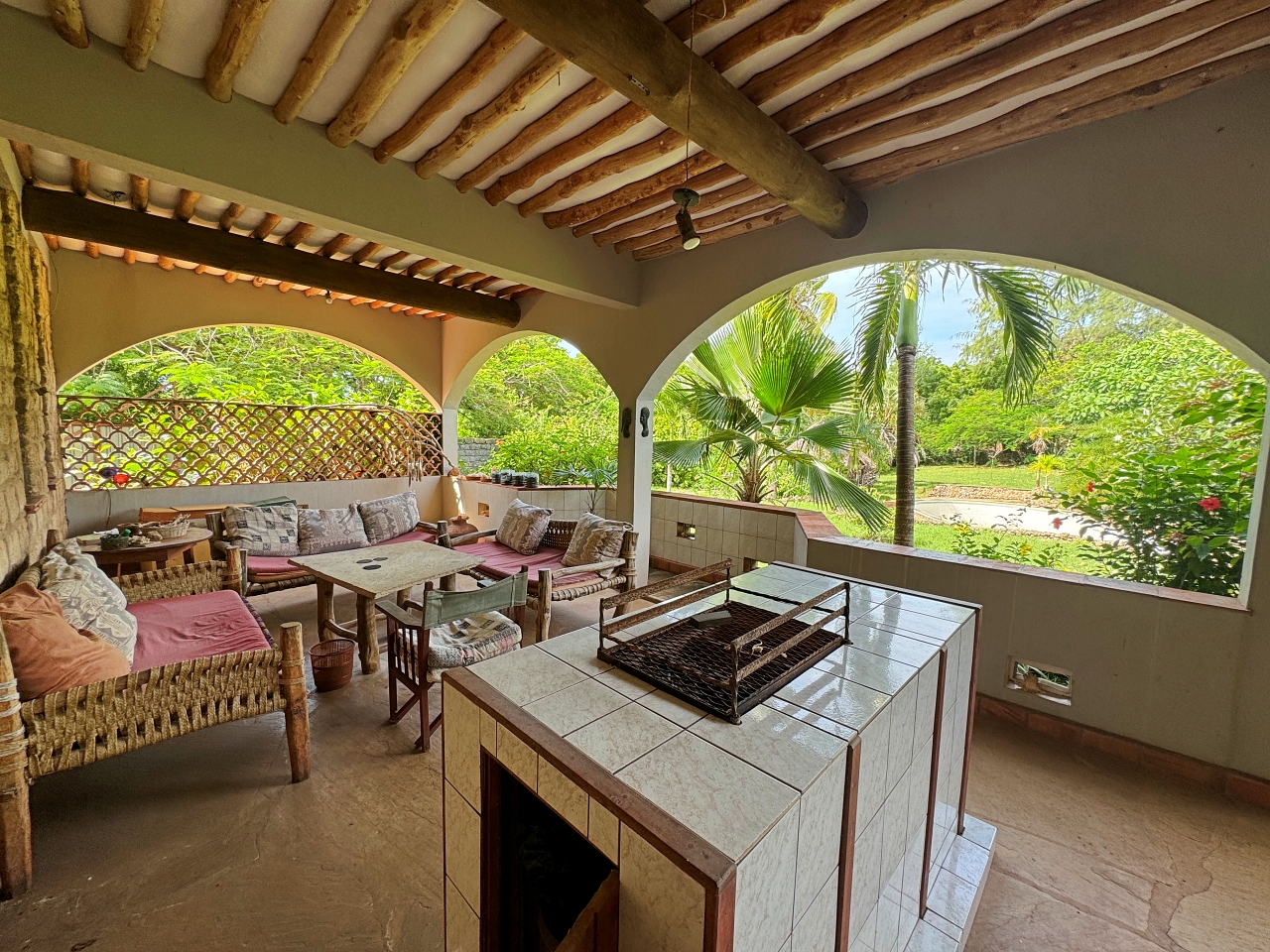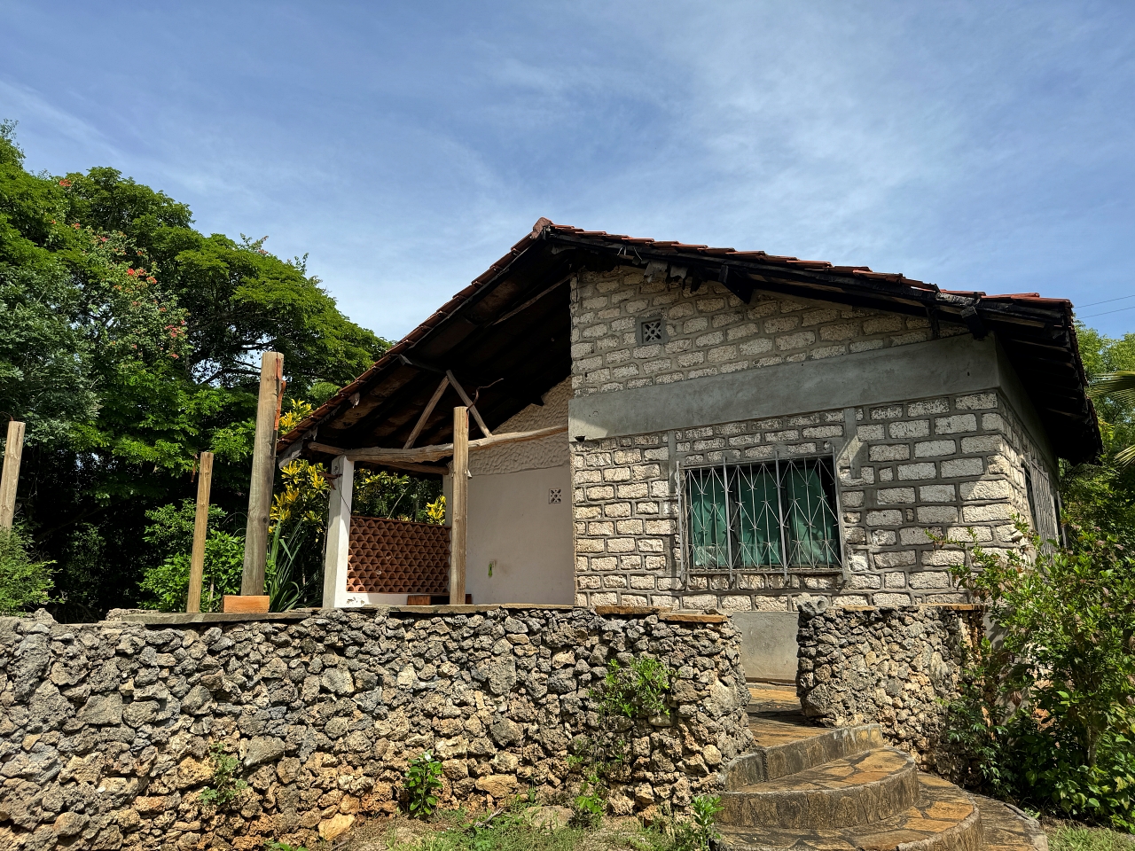 The house is well constructed and solid, made with concrete blocks. The tiling of the bathrooms, kitchen and floors are very well finished. The windows have hardwood frames with security bars and mosquito netting. The roof is tiled. The ceilings are high, there is plenty of light and the house is cool.