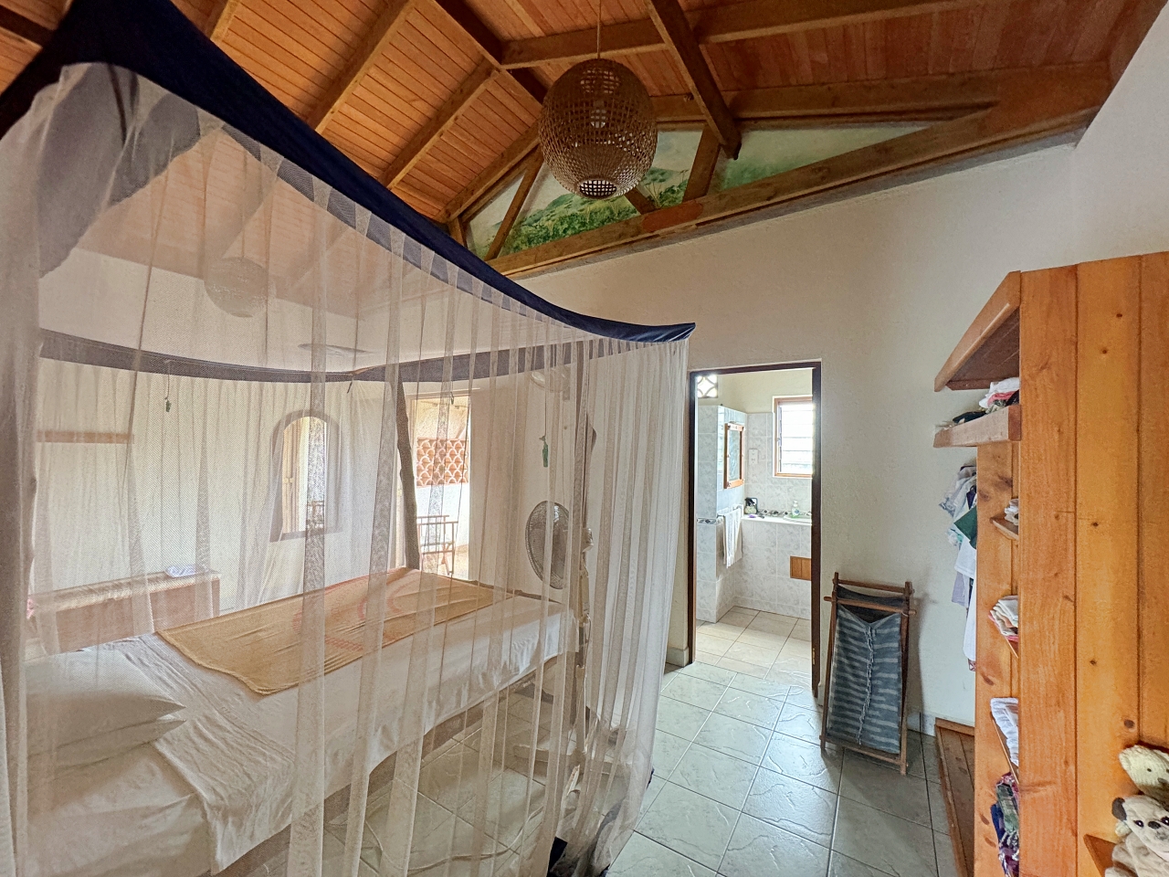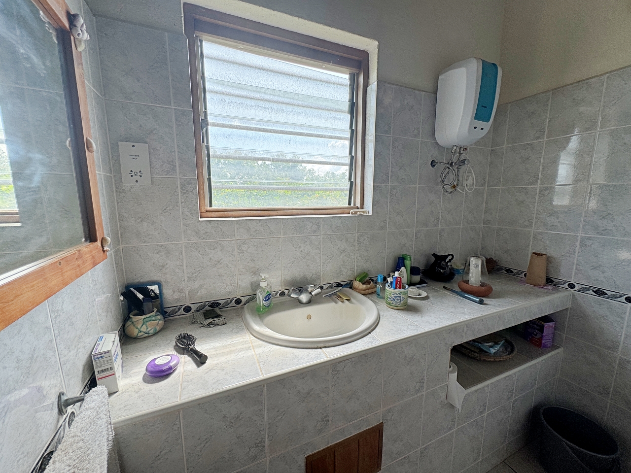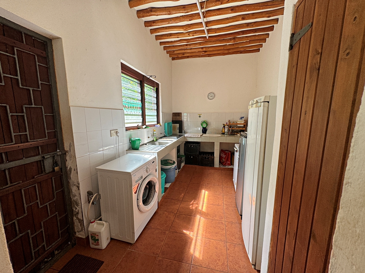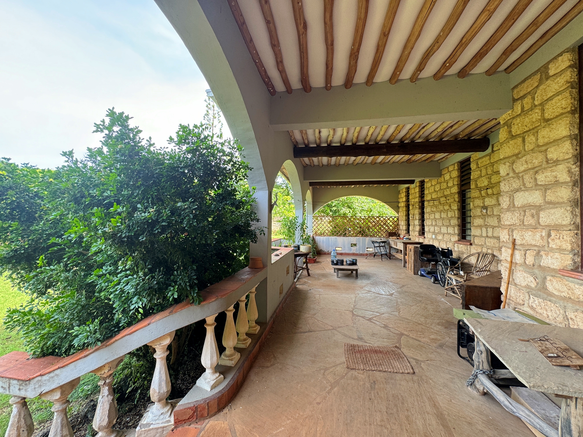 The house is well constructed and solid, made with concrete blocks. The tiling of the bathrooms, kitchen and floors are very well finished. The windows have hardwood frames with security bars and mosquito netting. The roof is tiled. The ceilings are high, there is plenty of light and the house is cool.