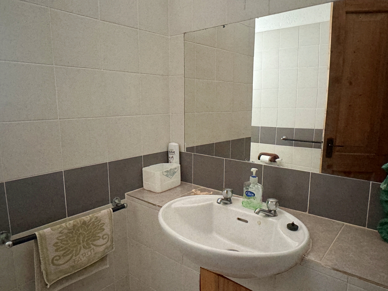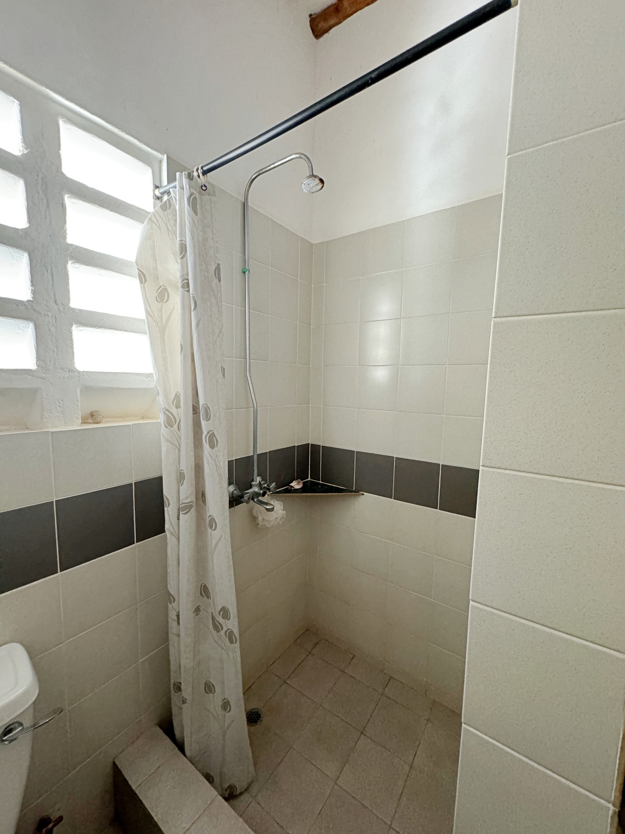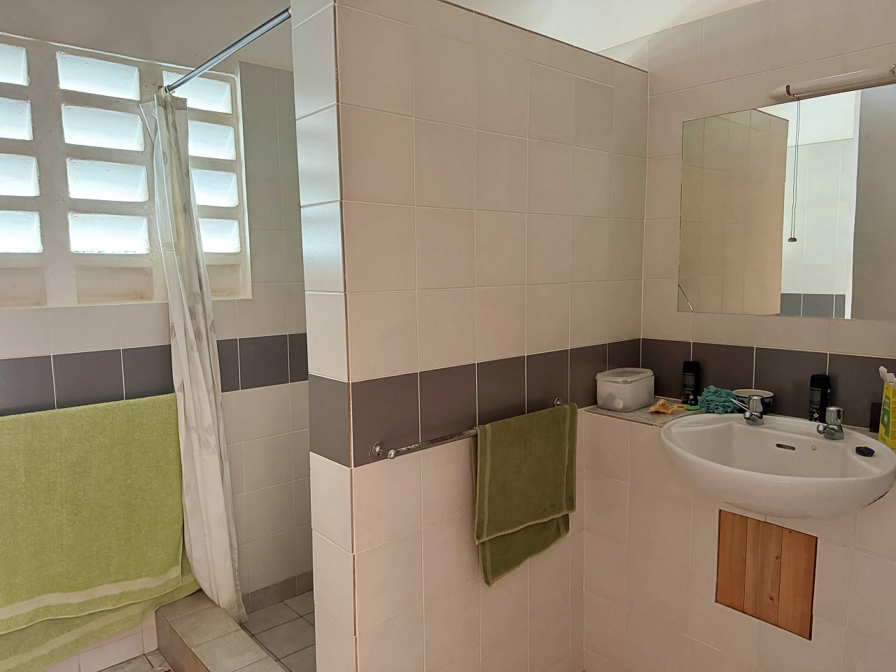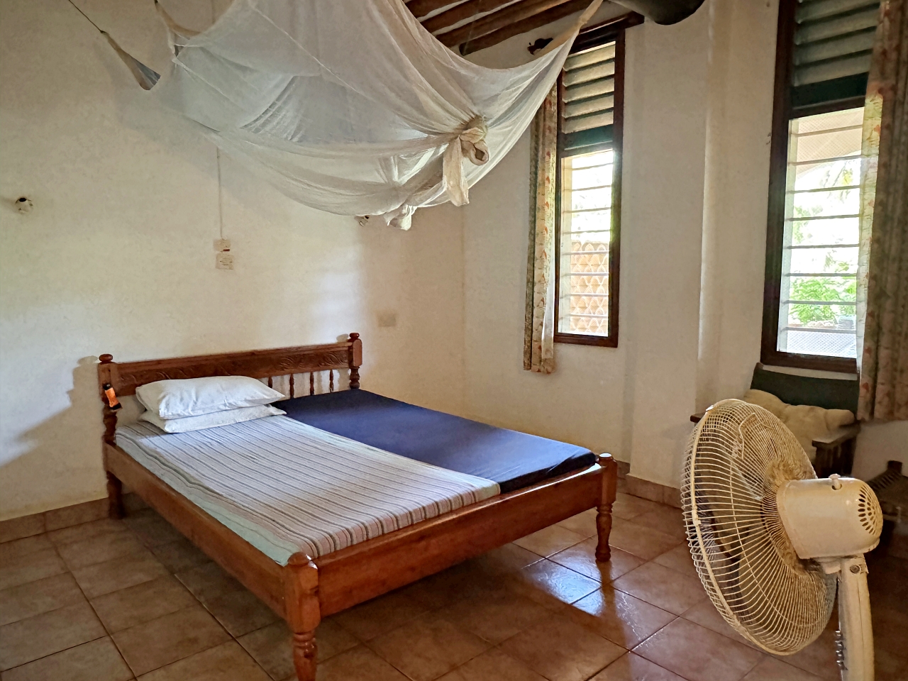 The house is well constructed and solid, made with concrete blocks. The tiling of the bathrooms, kitchen and floors are very well finished. The windows have hardwood frames with security bars and mosquito netting. The roof is tiled. The ceilings are high, there is plenty of light and the house is cool.