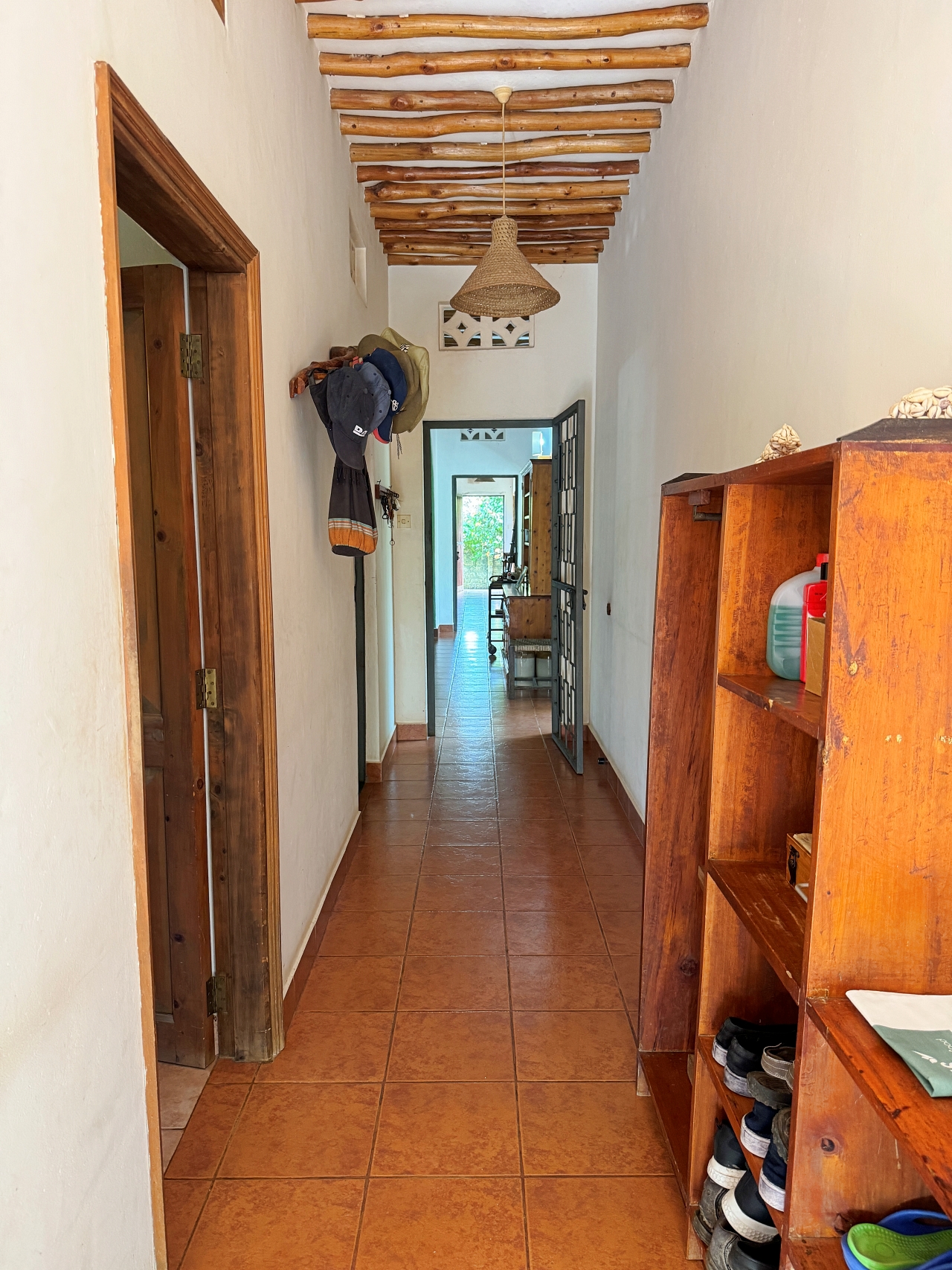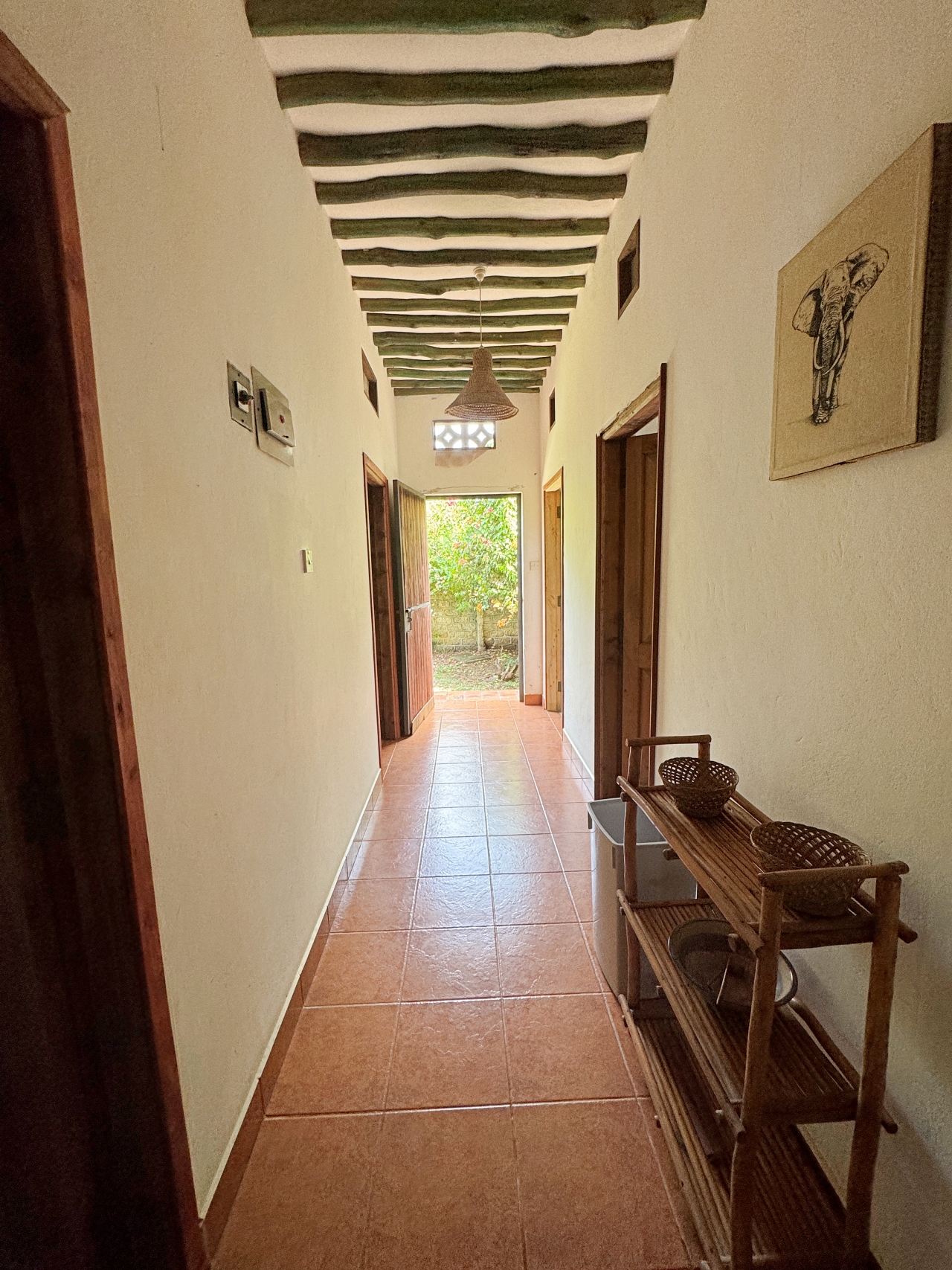 - Long corridor from one end of the house to the other with doors to outside on each side