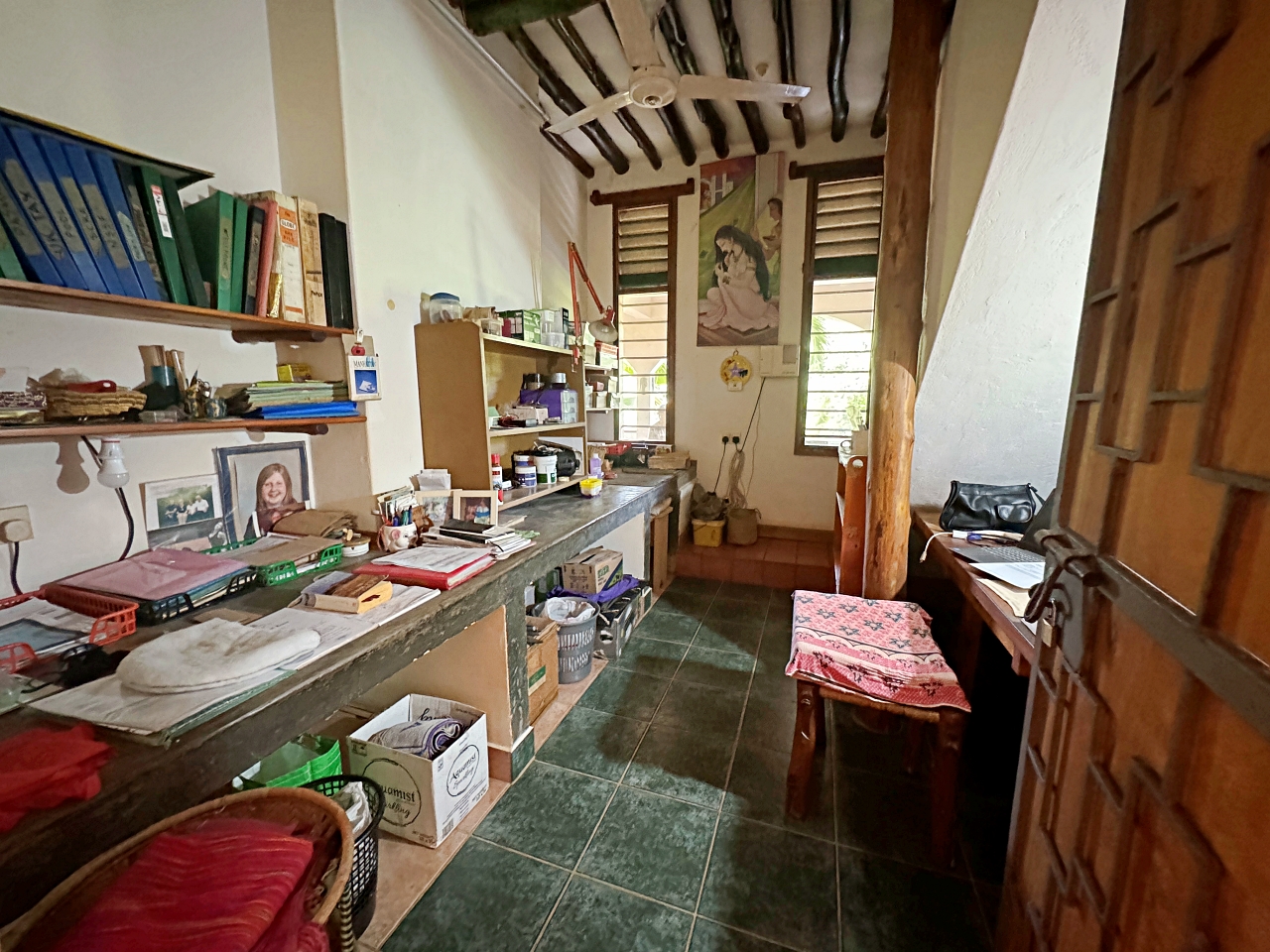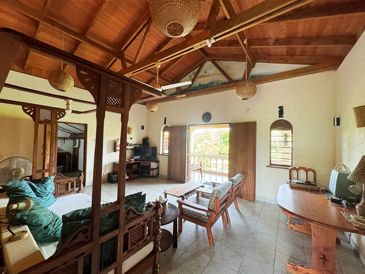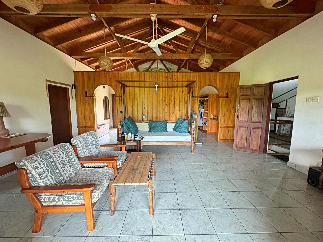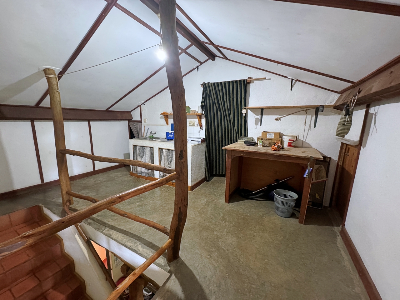 - Upstairs: Small apartment consisting of a living room, bedroom area, bathroom, kitchenette, terrace to the front/east overlooking the gardens and pool and a small terrace to the west for sunsets. There are also extra areas on each side that are currently being used as storage/workshop that can either be left that way or converted into extra bedrooms.