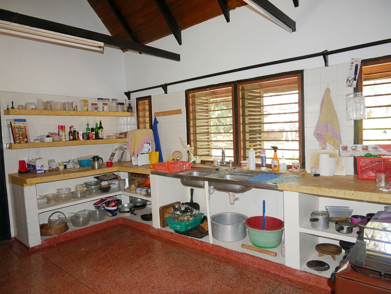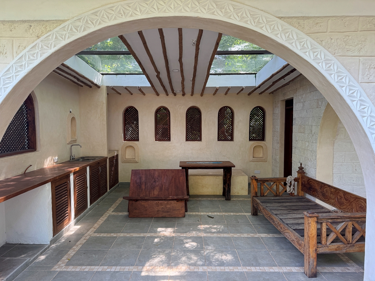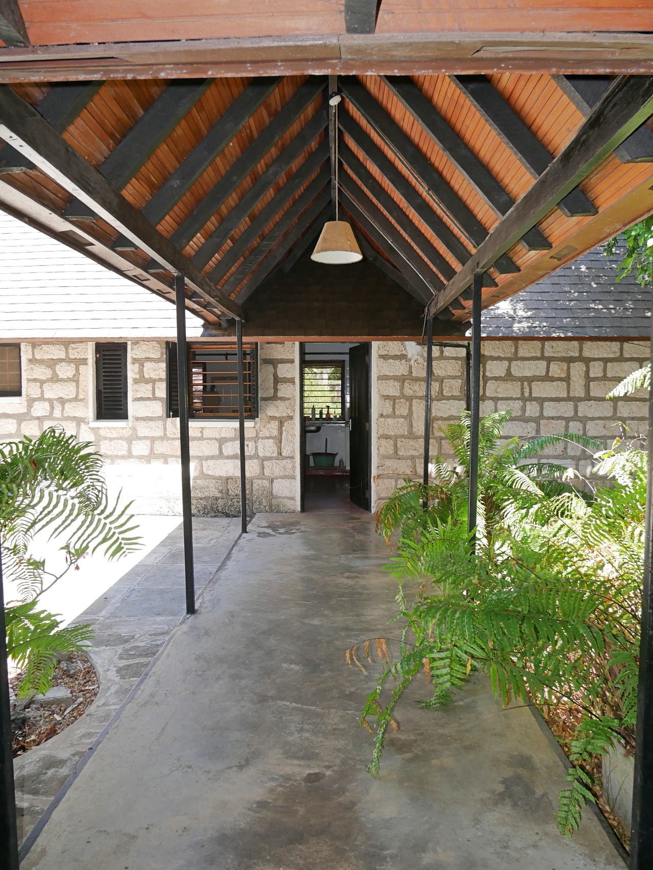 - There is a courtyard with a covered walkway to a large kitchen, pantry and dhobi room