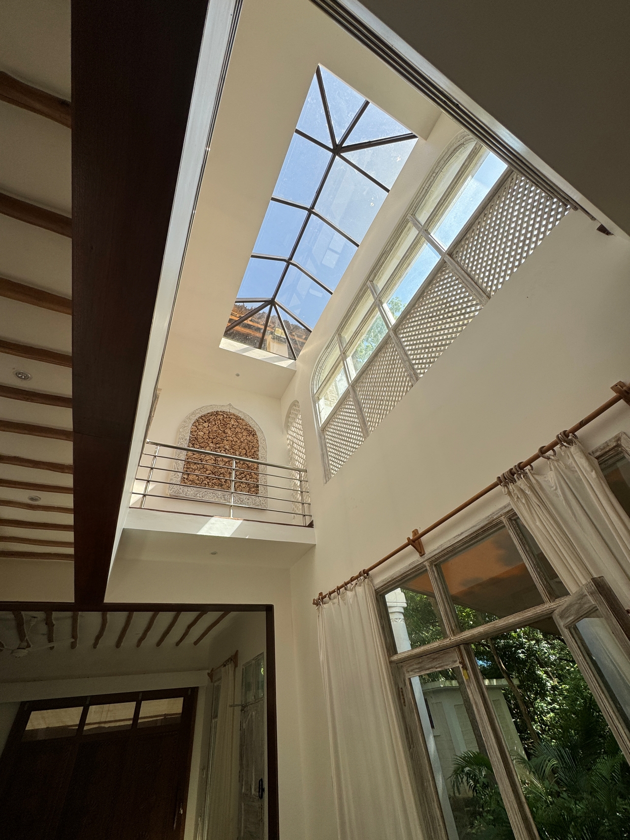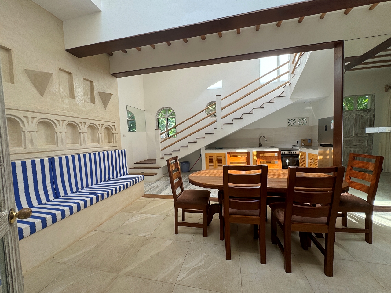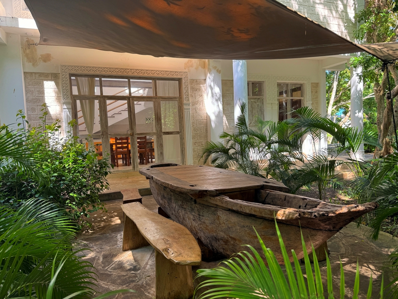 - There is a courtyard with a covered walkway to a large kitchen, pantry and dhobi room