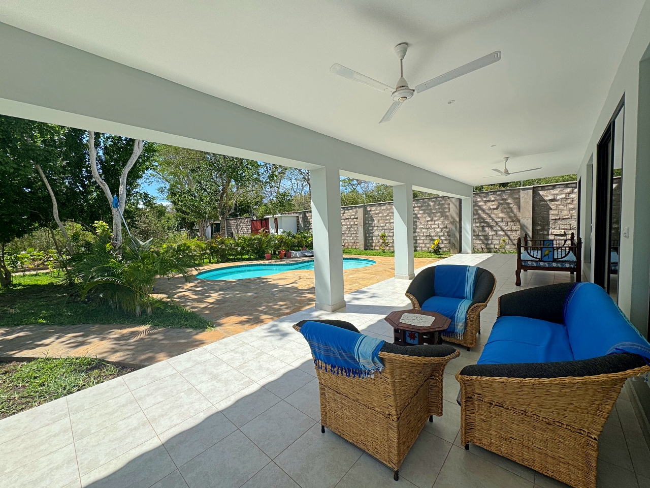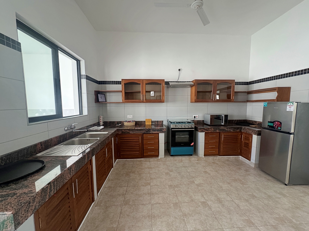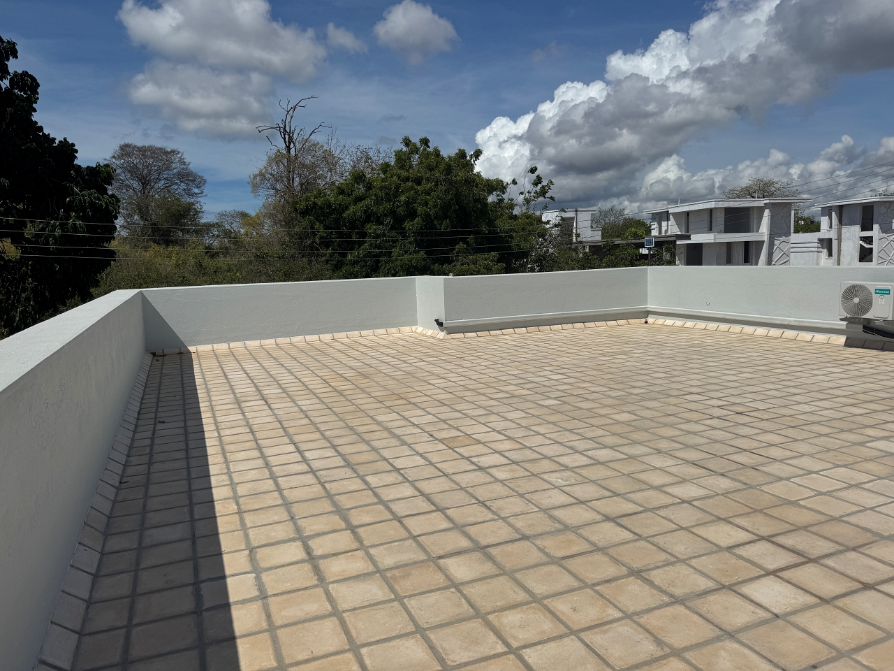2 bedrooms en-suite, very large kitchen with pantry/store, dhobi room, large sitting/dining area, verandah overlooking the pool, rooftop terrace.