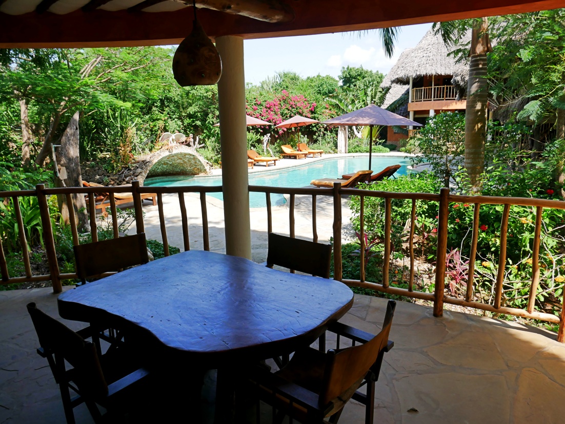 Upstairs: Large, open plan space with various areas including sitting/TV area, large terrace overlooking the pool, small terrace for private massage and a small sundowner terrace further up another flight of stairs.