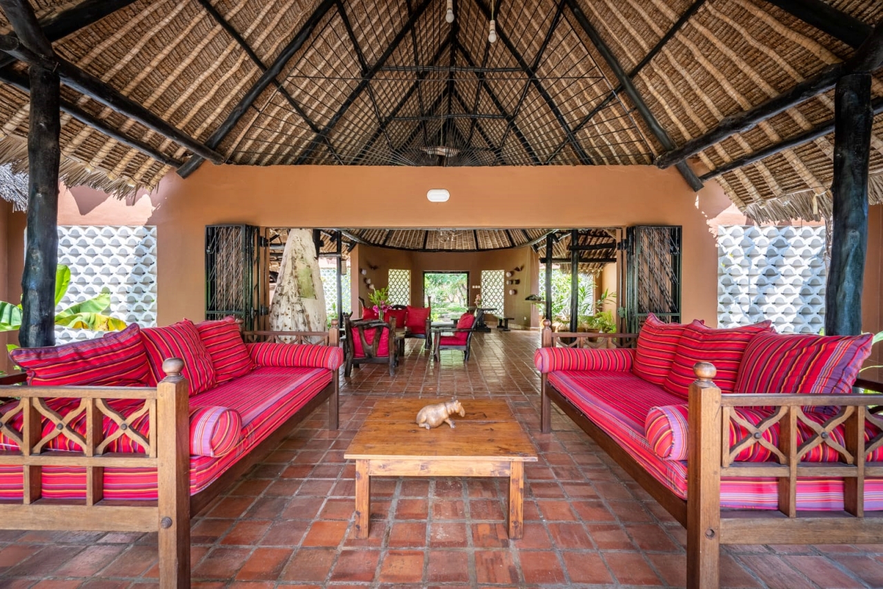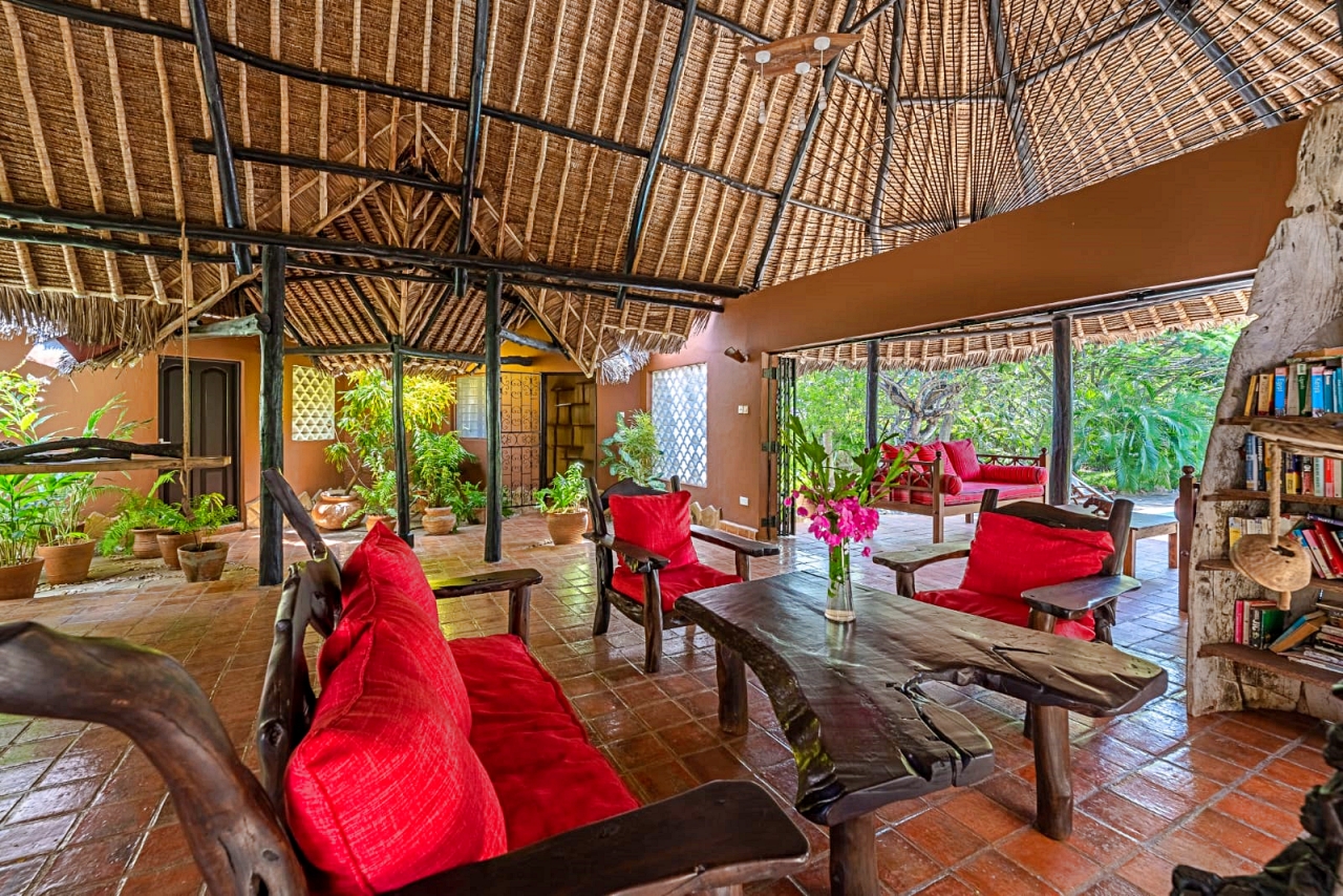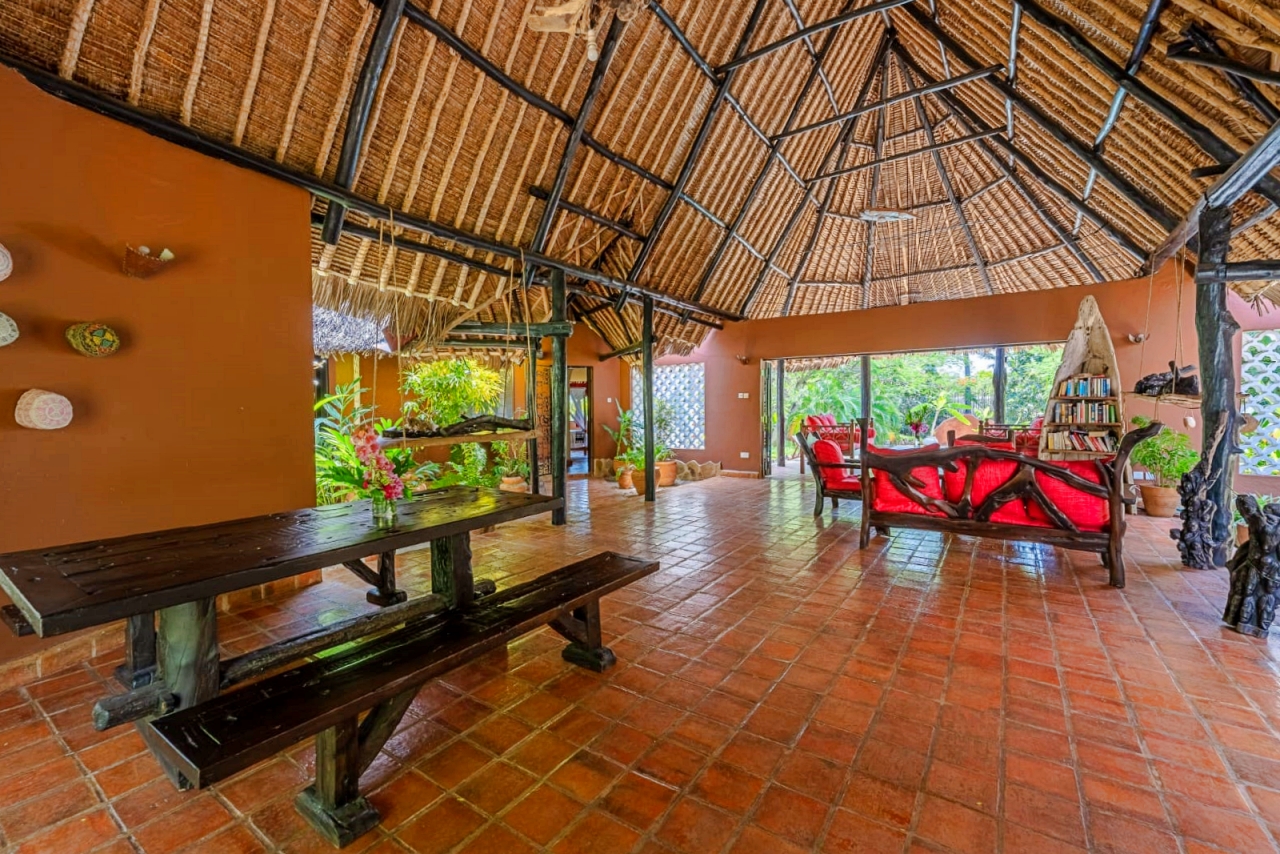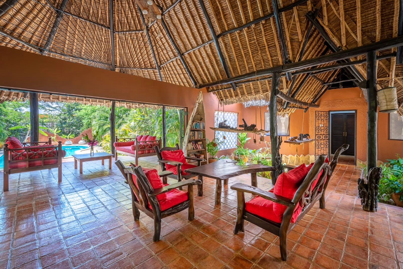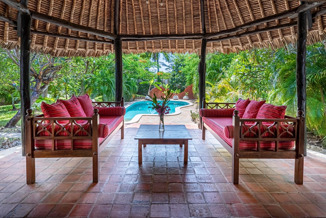 The inner pod is the living room under the makuti roof with a verandah overlooking the pool. The makuti roof was re-done in 2022.