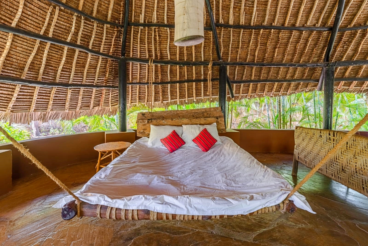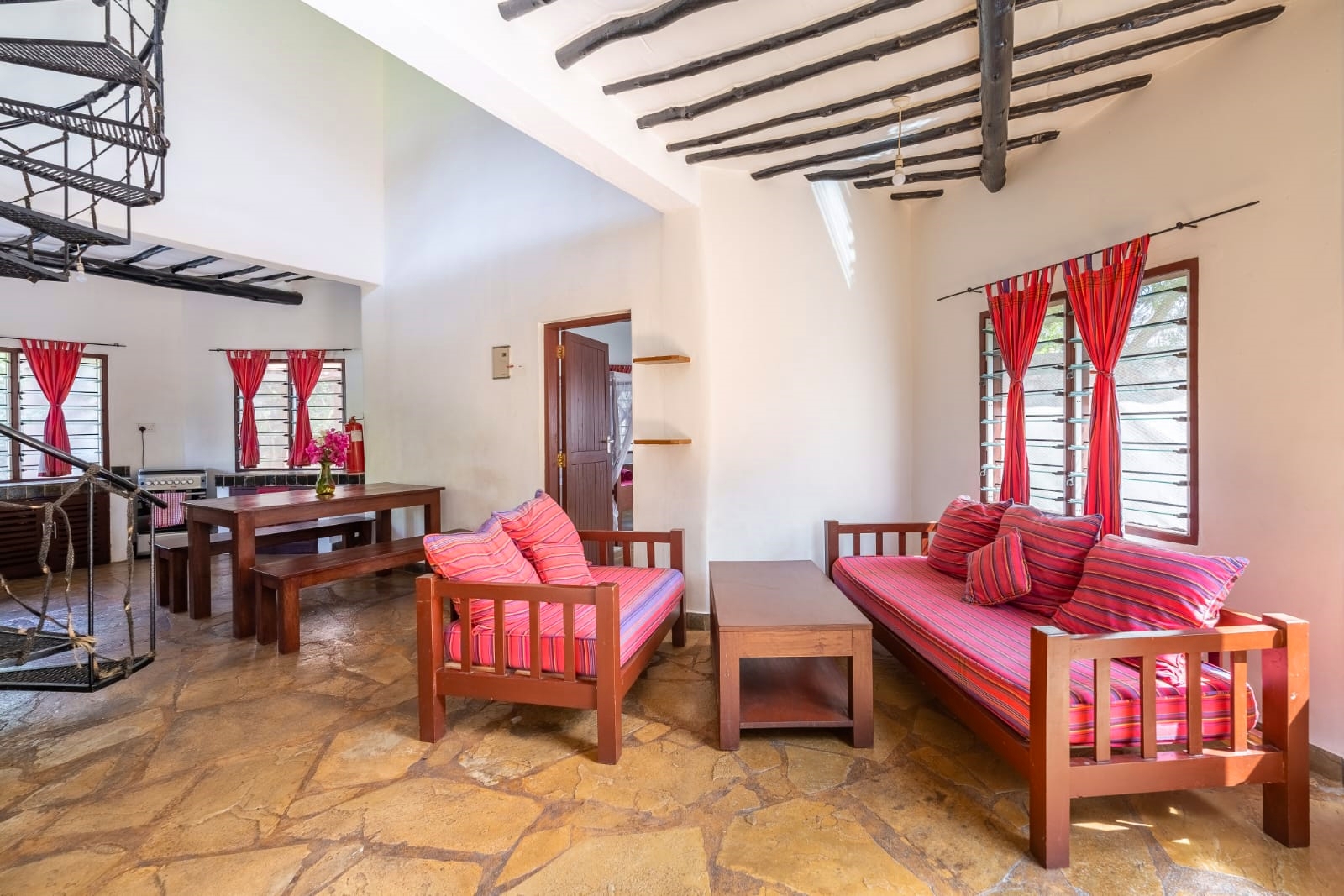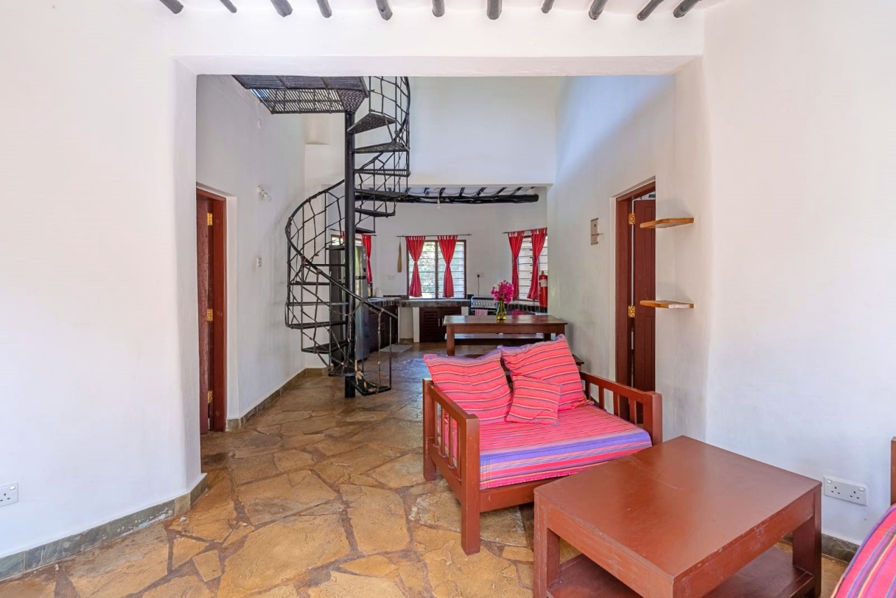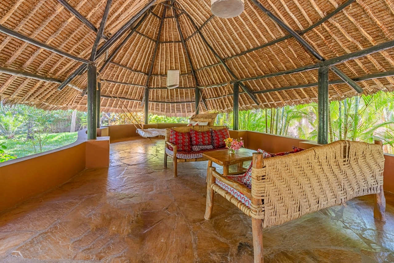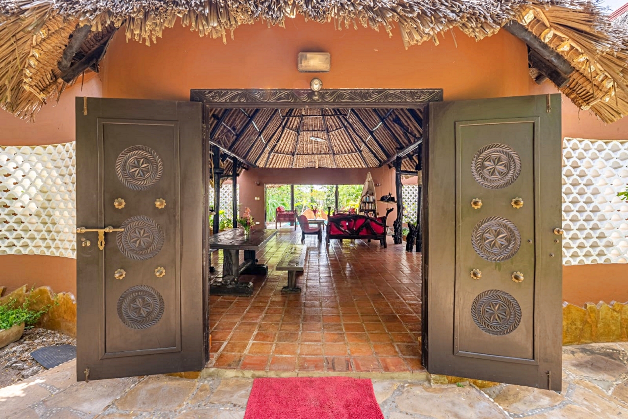 The inner pod is the living room under the makuti roof with a verandah overlooking the pool. The makuti roof was re-done in 2022.