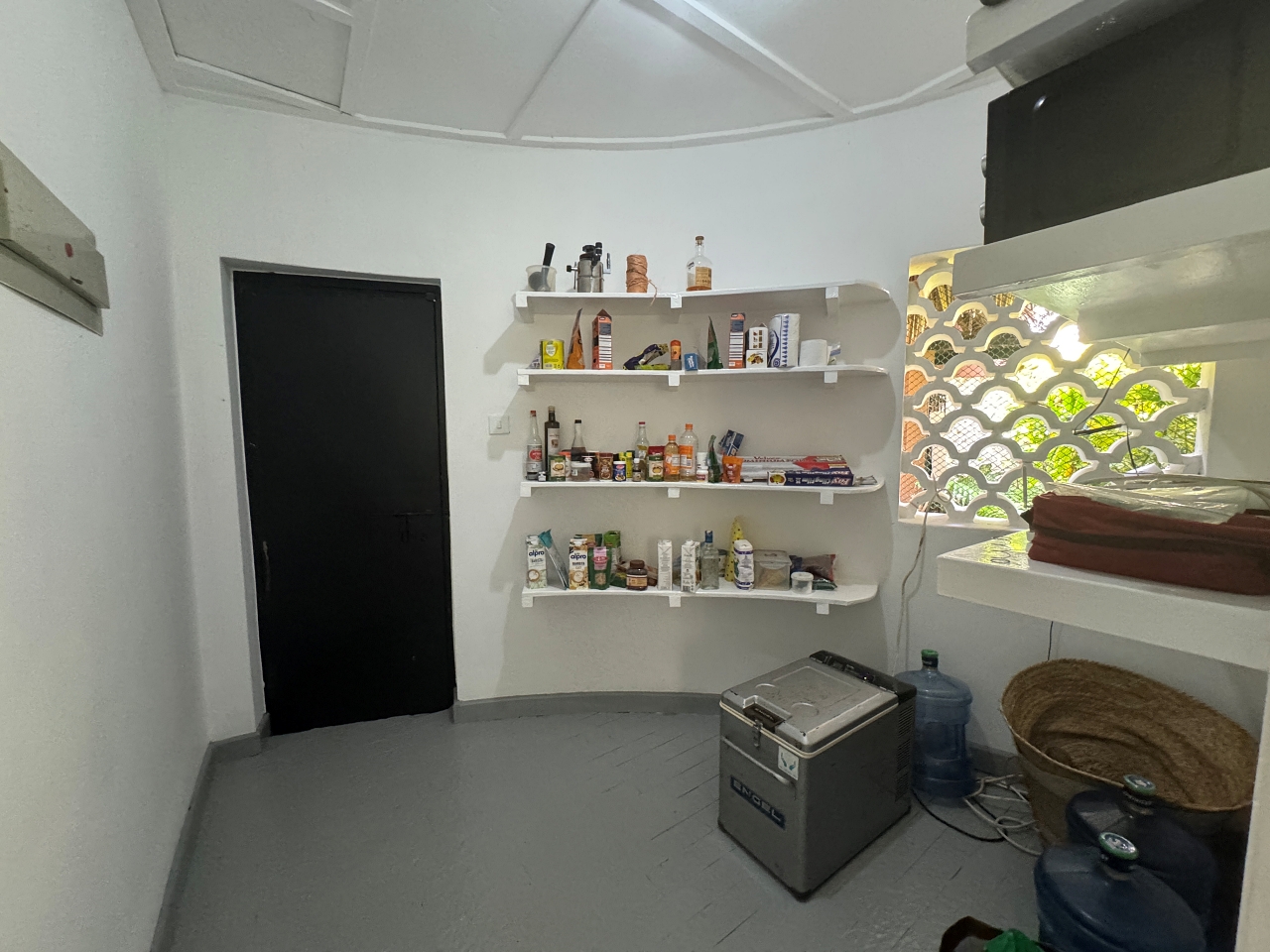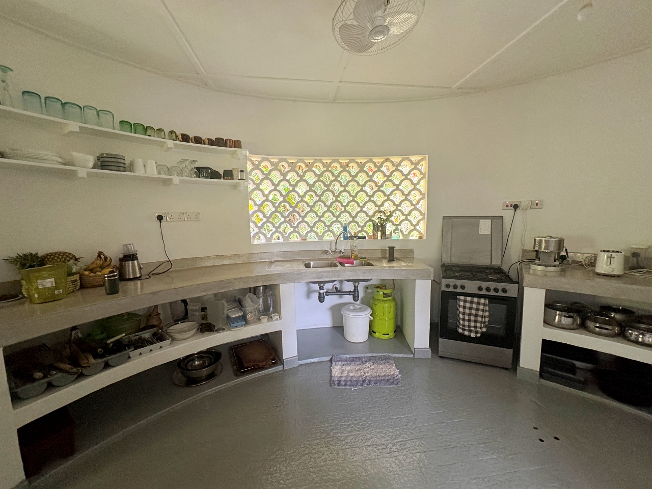 The main house, around 260sqm, is very well maintained is made up of a central semi-rectangular pod which is the sitting room with 2 x 2 circular pods on the left and right. 3 circular pods being bedrooms en-suite and one pod being the kitchen with store/ pantry and an inner room that can be used as a dehumidifying room/strong room. These 4 outer pods have a ceiling.