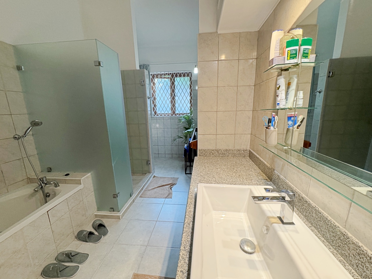 The master bedroom is a luxurious en-suite with air conditioning, while two additional bedrooms share a well-appointed bathroom. Each bedroom has a/c and a 43 inch TV.