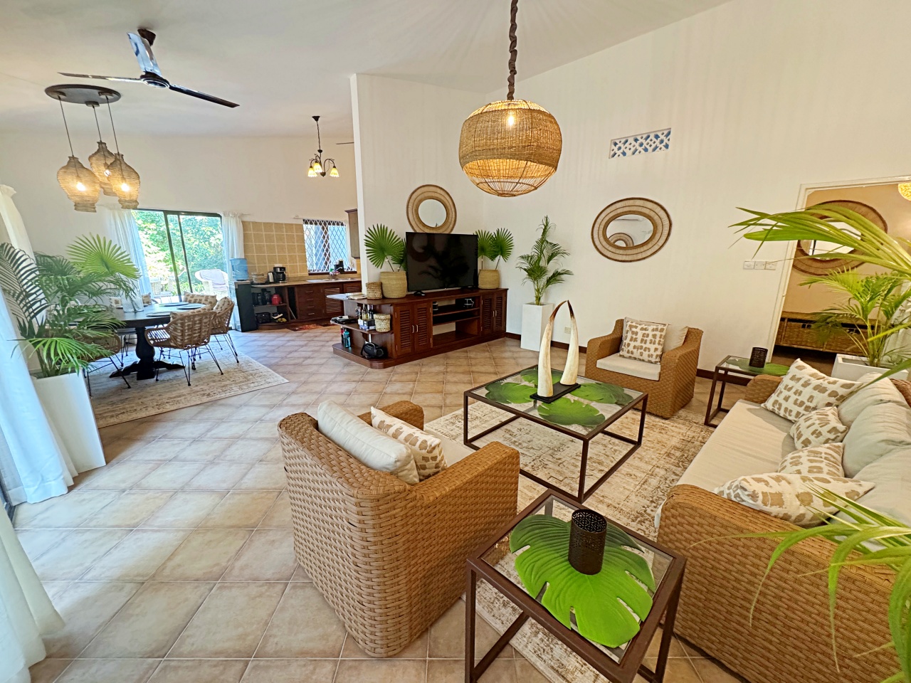 Enjoy lazy afternoons by your private pool, complete with sunbeds, or sip morning coffee on one of two verandahs overlooking pool and lush greenery. Inside, the spacious open-plan living and dining area offers a stylish space to relax and reconnect. After a sun-filled day, retreat indoors to enjoy the cool comfort of air-conditioning and unwind with your favourite shows on the 65-inch smart TV.
