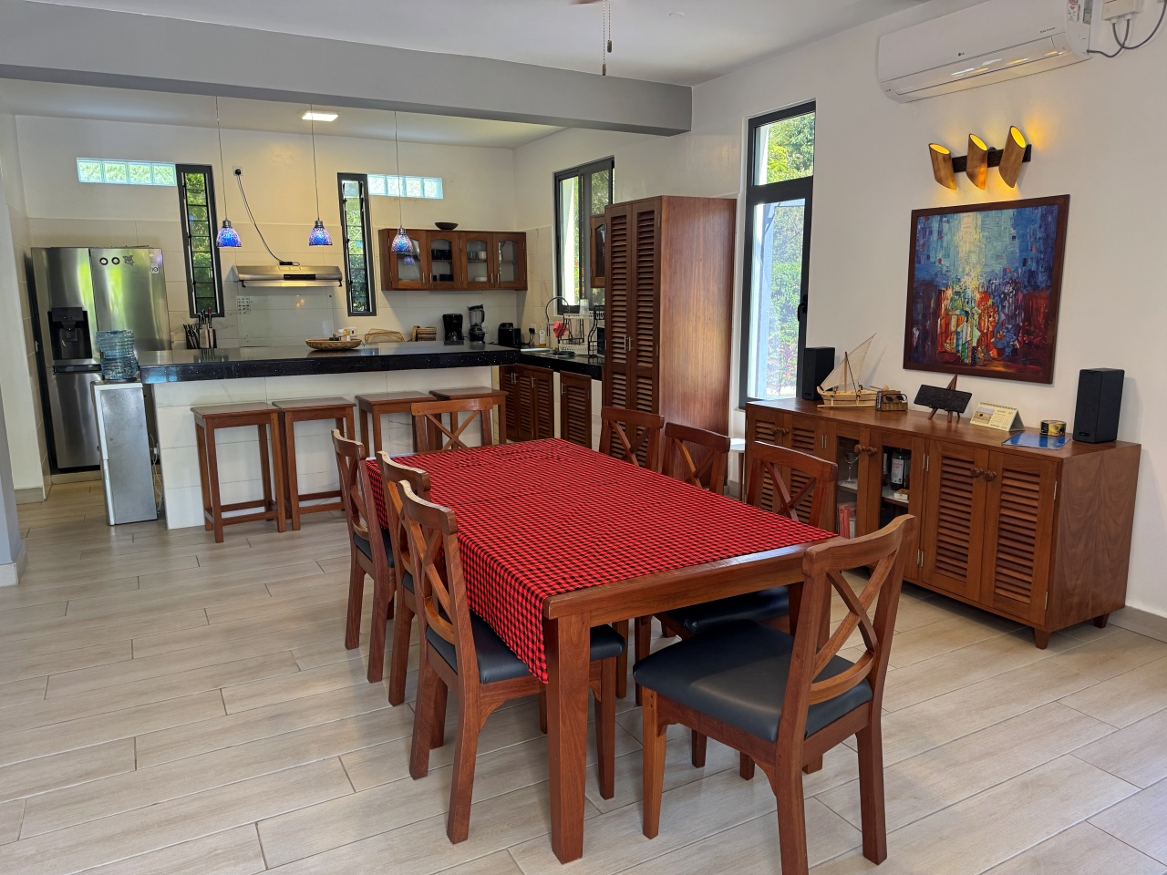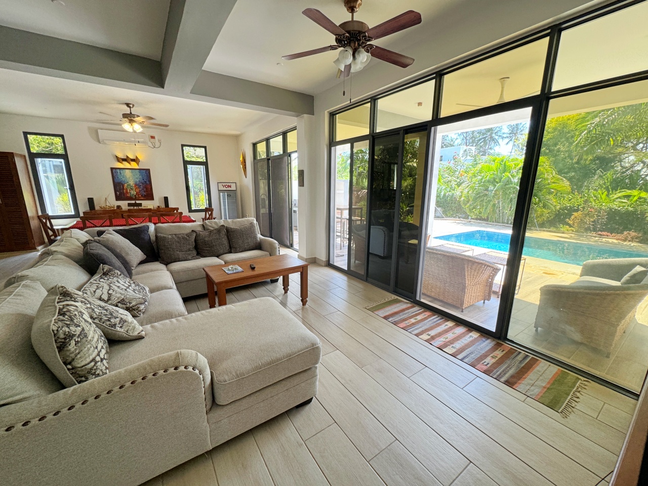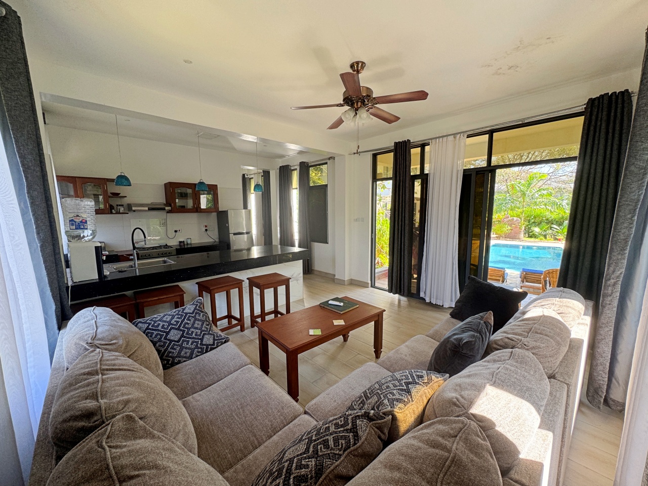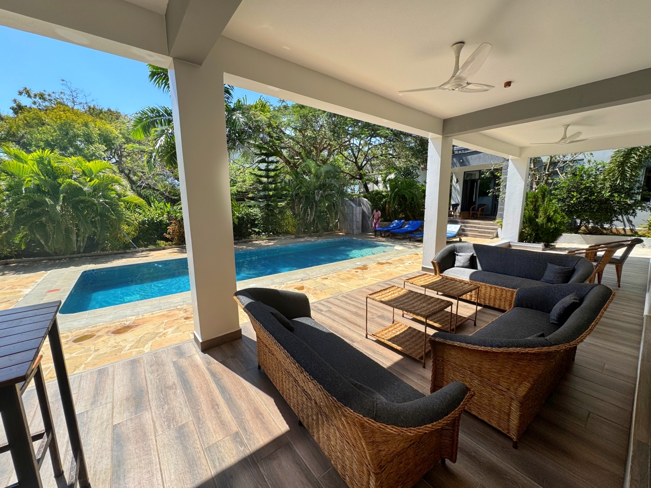 The verandah spans the length of the house overlooking the pool. Inside is an airy open plan kitchen, dining and living area. The large glass doors opening out onto the verandah are shaded to ensure the interior is kept cool. There is also a guest bathroom.